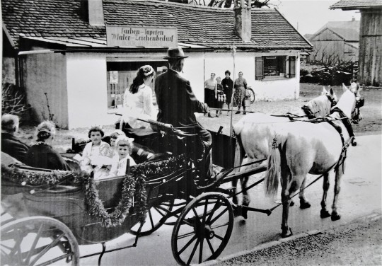 Die Kommunionskinder von Ösch und Steinach wurden vom Hansmarter nach St. Nikolaus und zurück kutschiert. Das Bild entstand 1943 in Pfronten-Ösch bei "Bäre", Tiroler Str. 57.