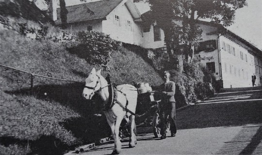 Das Hauptgeschäft vom Hansmarter aber war der innerörtliche Verkehr: Hitzelberger transportierte alles, was für ein kleines Handwägele zu groß oder zu schwer war. Mal holte er Langholz aus dem Vilstal, mal brachte er Kohlen ins unterste Steinach - und wenn erwünscht - kutschierte er auch Sommerfrischler durch die schöne Pfrontener Landschaft. Auch Dr. Fischer, zusammen mit dem alten Sanitätsrat Dr. Hiller praktizierender Arzt in den 30er Jahren, schätzte seine Dienste, wenn er in einer Winternacht zu einem Patienten gerufen wurde. Angesehen war Hitzelberger aber auch bei den Lausbuben des Ortes, die bisweilen als „blinde Passagiere“ von hinten auf den Wagen sprangen, nicht zur Freude vom Hansmarter. Wenn es zu viele waren, dann konnte es schon vorkommen, daß er mit der Geisel nach hinten schnalzte und das unerbetene Pack handgreiftlich vertrieb. Sonst aber wird der Hansmarter als friedlicher und sanfter Mensch beschrieben.