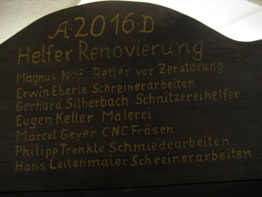 Am Ende möchte ich mich bei allen Beteiligten bedanken. Bei unserem Pfarrer Leumann für das offene Ohr und dem Vertrauen, das er uns entgegengebracht hat, des weiteren danke ich meinem Kollegen Erwin für die fachliche und handwerkliche Unterstützung, sowie allen, die in irgendeiner Weise an der Restaurierung beteiligt waren. Ich bin mir sicher, dass unser gemeinsames Wirken zur Ehre Gottes beiträgt und der Beichtstuhl in St. Leonhard einen würdigen Platz gefunden hat.