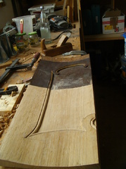 Mitte: Aufbau des rechten Teilstücks mit Kniebank. Am hellen Holz erkennt man die fehlenden, jetzt ergänzten Teile.