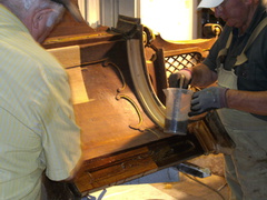 Nun mussten wir den fertigen Beichtstuhl aber wieder zerlegen, um die neuen Teile dem alten Farbton anzupassen. Wir wuschen und putzten die alte Farbe ab und nach einigen Schleifarbeiten konnten wir alles neu beizen. Auch die teilweise abgegangene Goldfarbe musste ersetzt werden. Am Ende wurde der ganze Beichtstuhl zum Schutz noch komplett neu geölt.