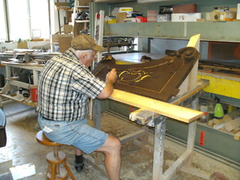 Unten links: Anpassung der restaurierten Teile an die alte Farbgebung. Dieser Arbeitsgang muss mehrmals wiederhoilt werden, dazwischen liegen immer wieder Trocknung und Zwischenschliff.