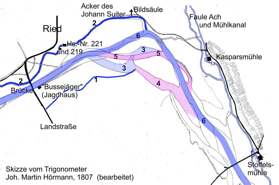 5 Flussbett am 16. September 1807 6 Flussbett heute